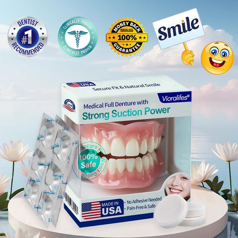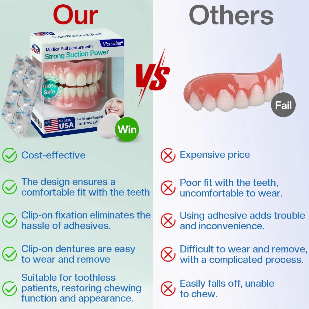"I recently had a visit to my dentist, who recommended expensive teeth implants to fix my poorly fitting dentures. The cost was overwhelming, and I felt hopeless until I discovered the VioralifesĀ® Medical Full Denture. Using VioralifesĀ® Medical Full Denture Set was the best decision I ever made! It was easy to use, and the results were phenomenal. This dentures fit perfectly, giving me the confidence to smile again without discomfort or insecurity. The snug, comfortable fit has eliminated the soreness I used to experience, and I can eat and speak with ease. Best of all, I achieved these amazing results at a fraction of the cost of implants. Ā VioralifesĀ® Ā has truly boosted my confidence and saved me from an expensive dental procedure. I highly recommend it to anyone facing similar challenges with their dentures!" -Ā Maria Clarke