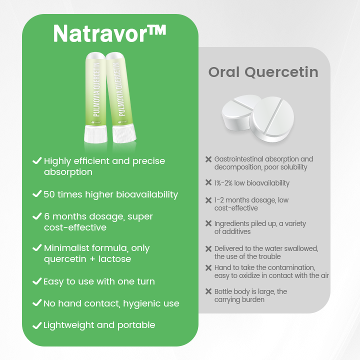 For years, oral quercetin supplements have shown limited effectiveness due to poor water solubility and degradation in the digestive tract—resulting in a bioavailability of just 1–2%. Natravor® Pulmovia Quercetin Lung Detox Inhaler changes everything. Powered by our advanced 5-micron ultra-fine powder flow technology, Pulmovia delivers pure quercetin directly to the alveoli, bypassing the gut for an incredible 98% absorption rate—50 times more efficient than capsules or tablets. With every inhale, your lungs receive fast, concentrated antioxidant and detox support, making better breathing not just possible—but effortless.