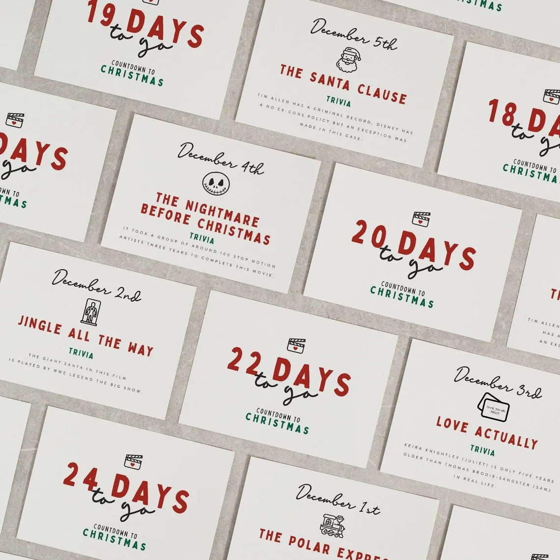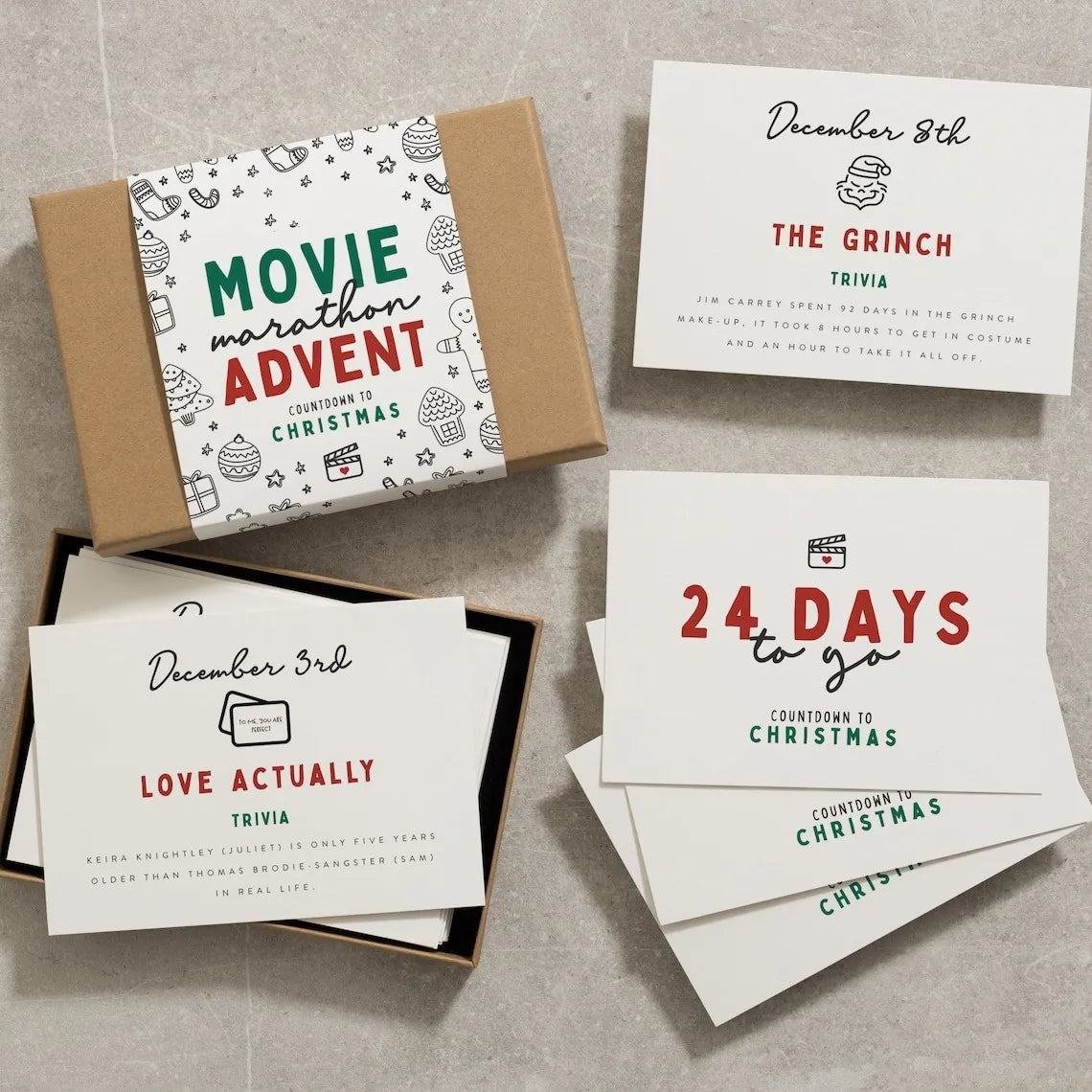 🎅🎄Each box of our Deluxe Advent Calendar contains 24 cards with Christmas movie names and some fun trivia! A lovely gift for him or her, the family or for any movie fan!